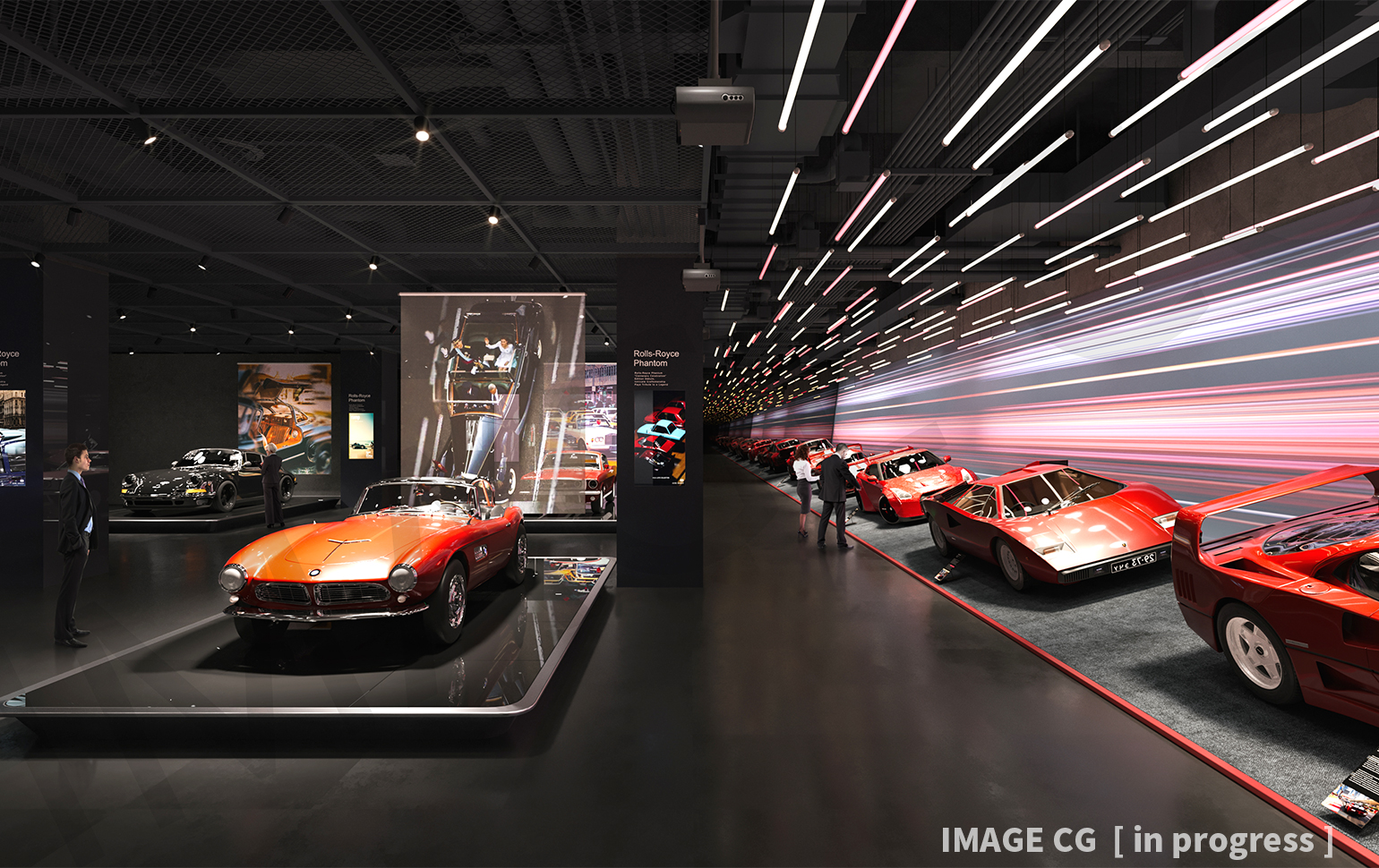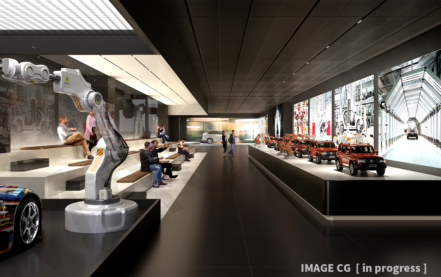 はっきりとした白と黒のモノトーンを基調に空間全体がゾーニング・設計されており、その中に車を取り巻く様々なシーンが設定されている。