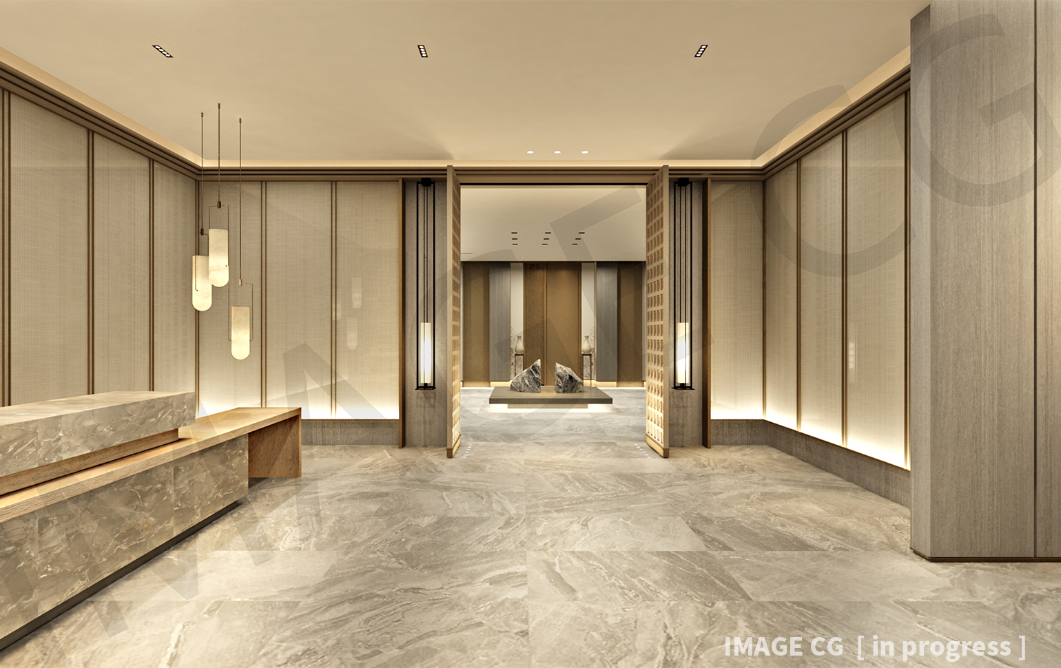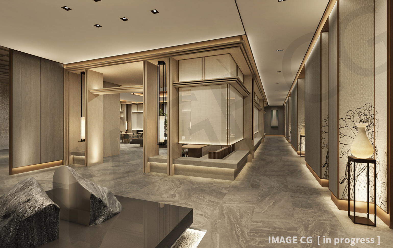 トラディショナルな中華的装飾とモダンなデザインが融合された内装設計に対して、照明計画は高級感を演出するようにミニマルな光を随所に散りばめつつ、意匠を助長する様に装飾的な光源が視界に入るように設計している。